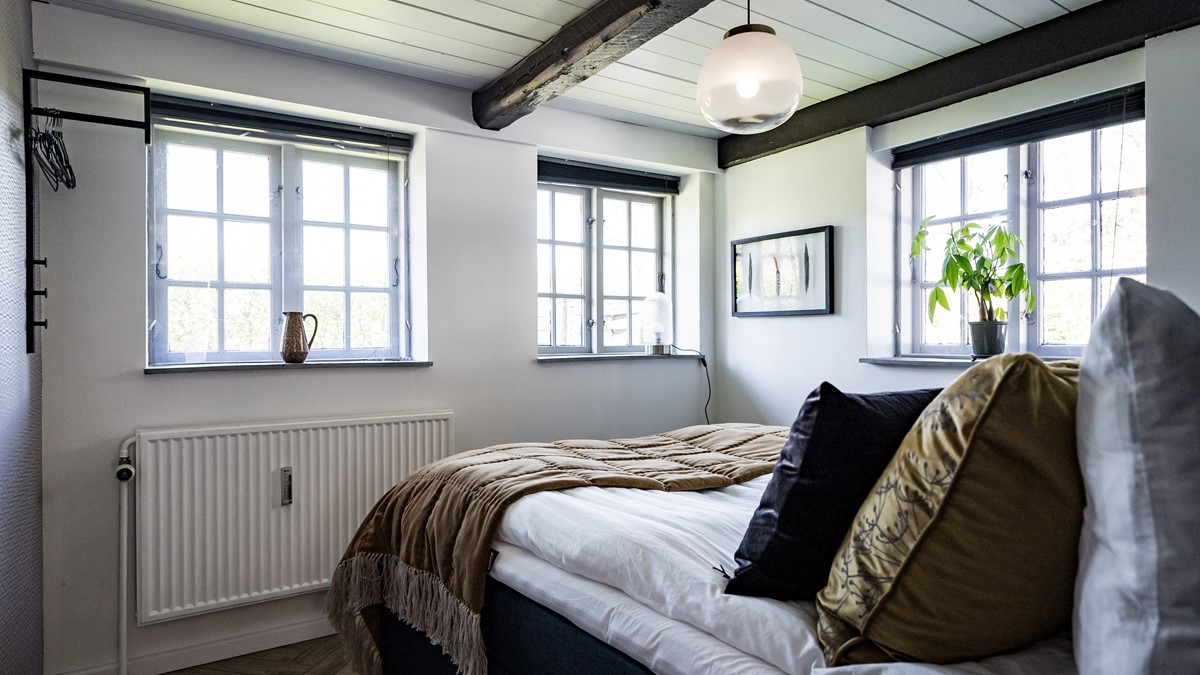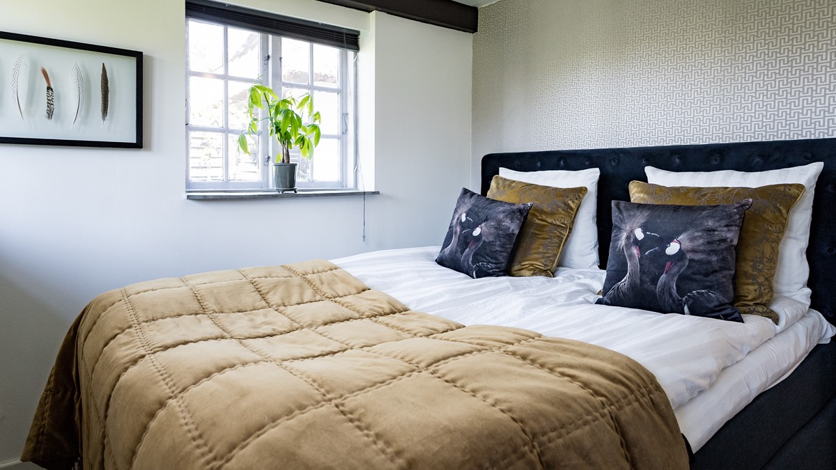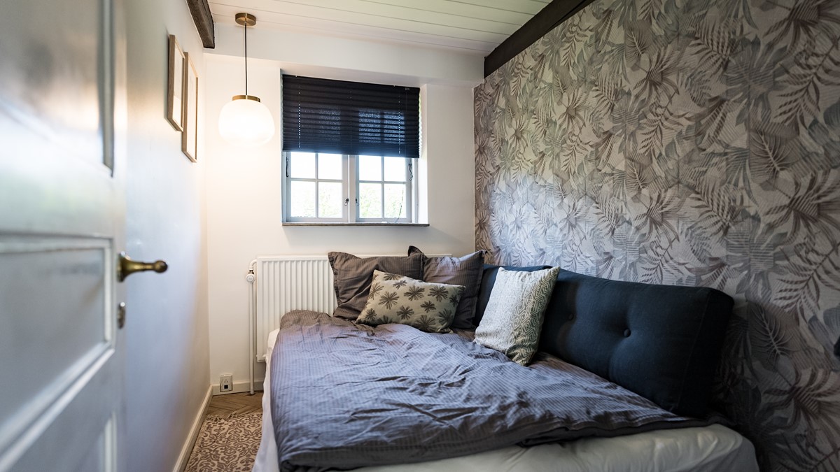 Dette er et mindre værelse og med plads til det mest nødvendige. Der er seng på 160 * 200, sengebord og lidt plads til tøj. Der er direkte udgang til have. Meget smagfuldt indrettet af boligstylist. Eget bad/toilet ligger i tilknytning til værelset.